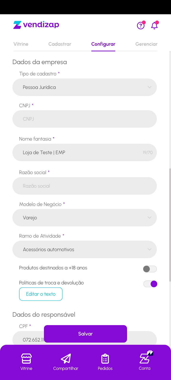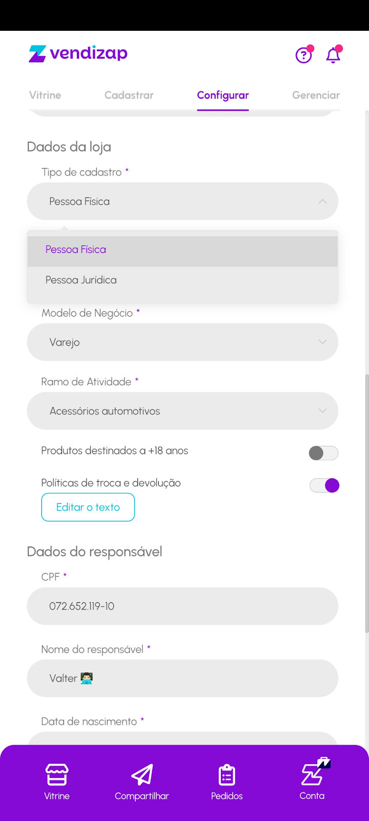 Ao iniciar o uso da plataforma Vendizap, é possível começar com um cadastro simples usando o CPF. Porém, se sua operação evoluir e você desejar utilizar um CNPJ, a troca pode ser feita de forma simples nas configurações da loja.