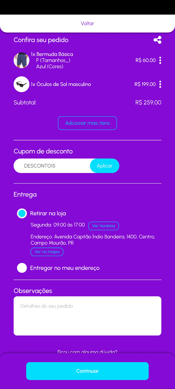 Durante o processo de finalização do pedido, o cliente verá um campo chamado “Cupom de desconto”.