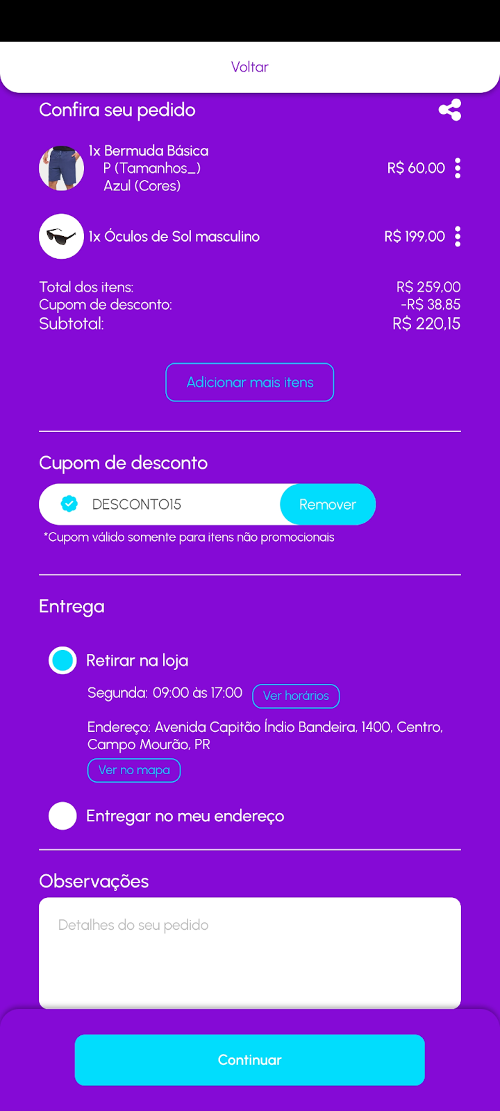O cupom pode ser removido pelo próprio cliente clicando em “Remover”.