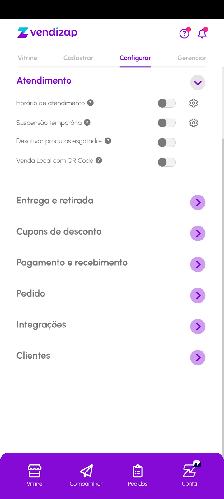 No menu inferior da plataforma, clique em "Configurar". Dentro das configurações, selecione a opção "Atendimento". Você verá diversas opções relacionadas ao funcionamento da loja.