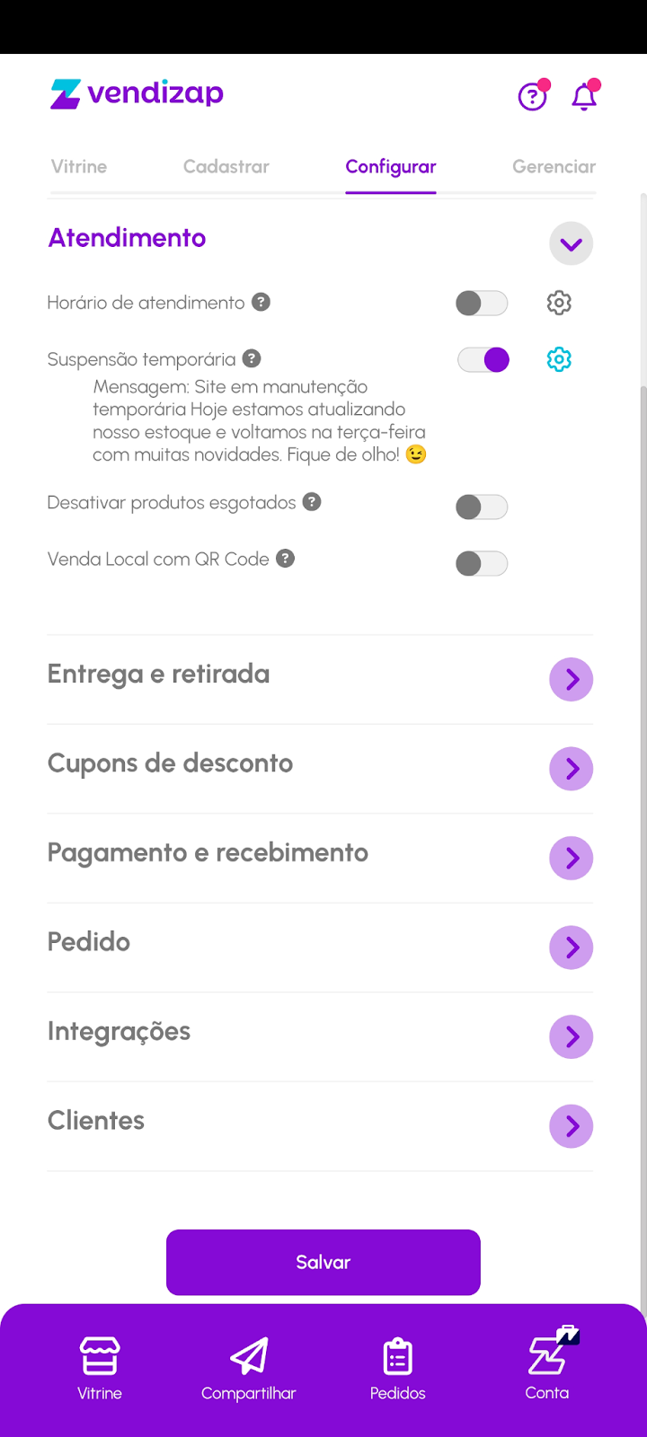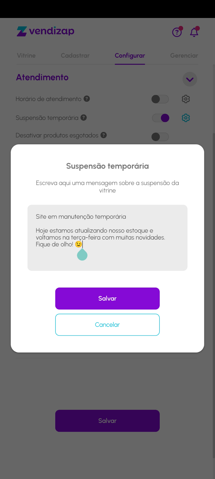 Digite a mensagem explicando o motivo da suspensão (ex: “Estamos atualizando nosso catálogo e retornaremos em breve”). Depois clique em "Salvar".