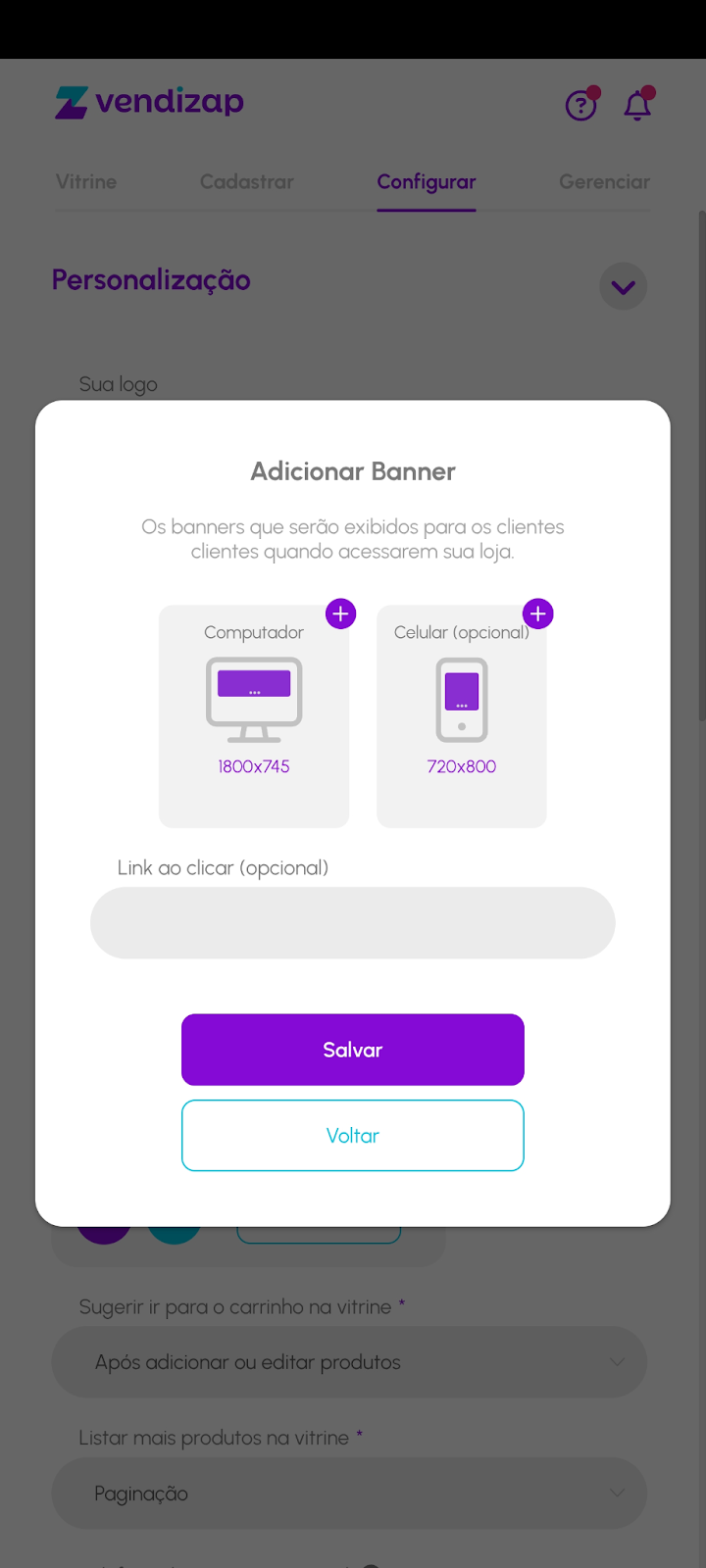 O Vendizap exibe banners distintos para computadores e celulares, por isso, você deve preparar duas versões da mesma imagem: