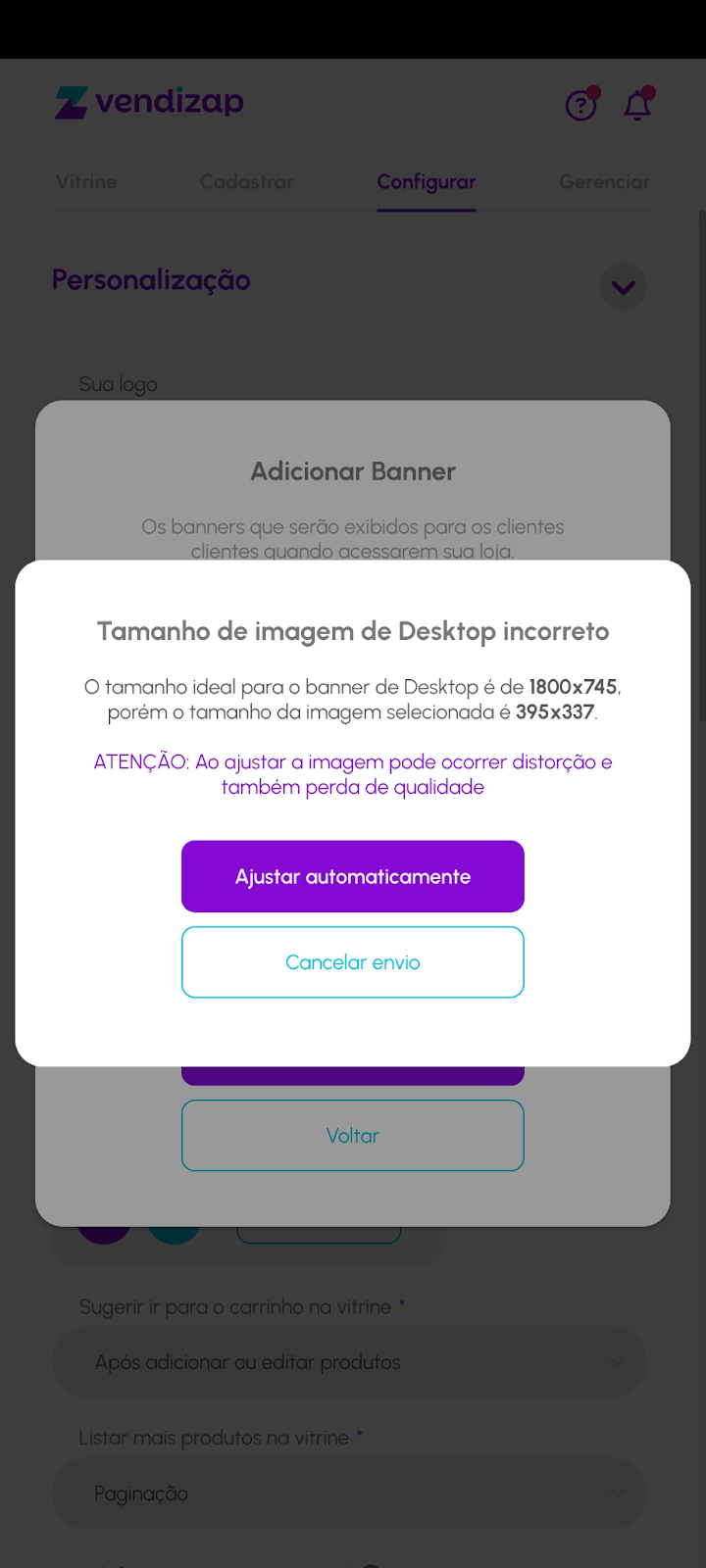 Caso a imagem enviada não esteja no tamanho correto, o sistema alertará sobre a dimensão incorreta. Você pode optar por ajustar automaticamente, mas isso pode afetar a qualidade da imagem.