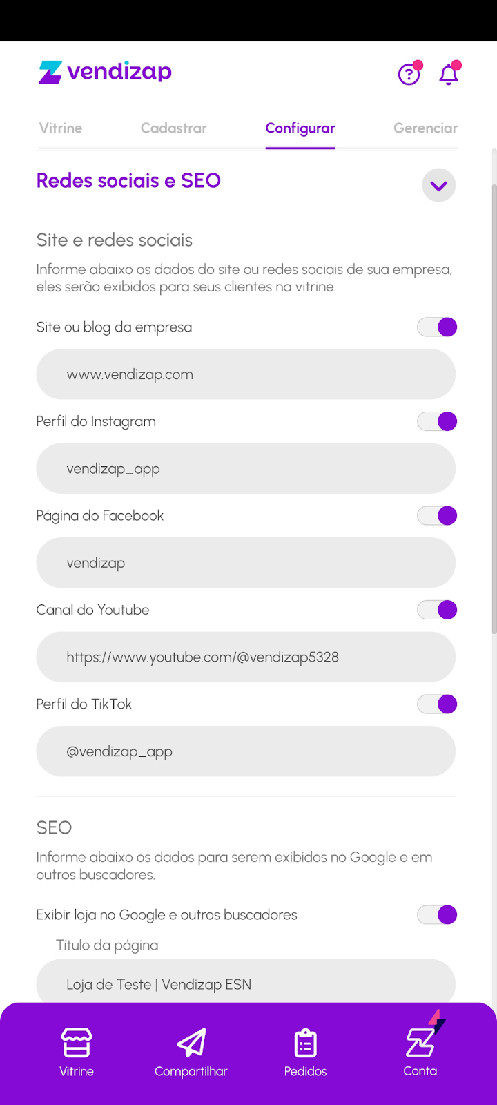 Configurar as redes sociais no Vendizap ajuda seus clientes a acompanharem a loja na internet e aumenta a credibilidade, pois confirma que sua loja é real e confiável.