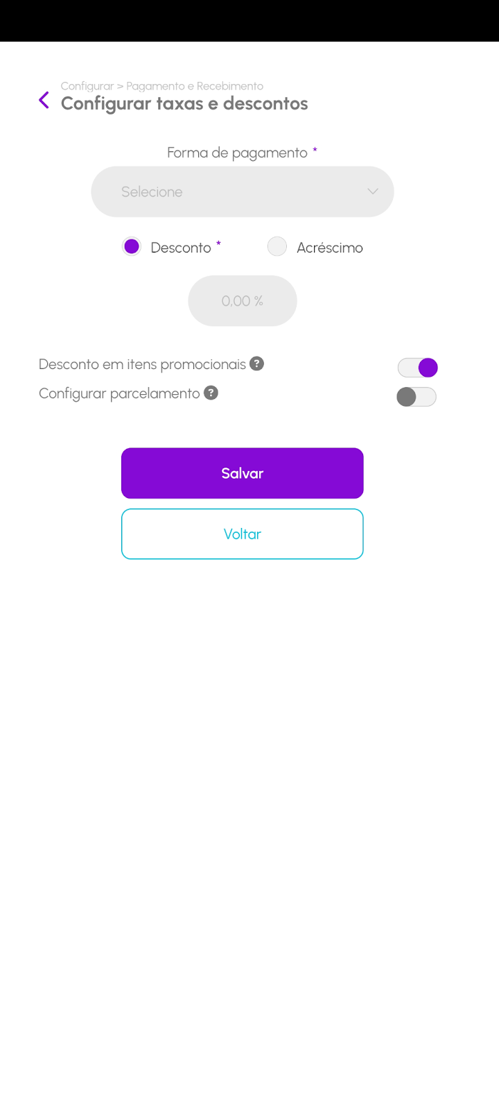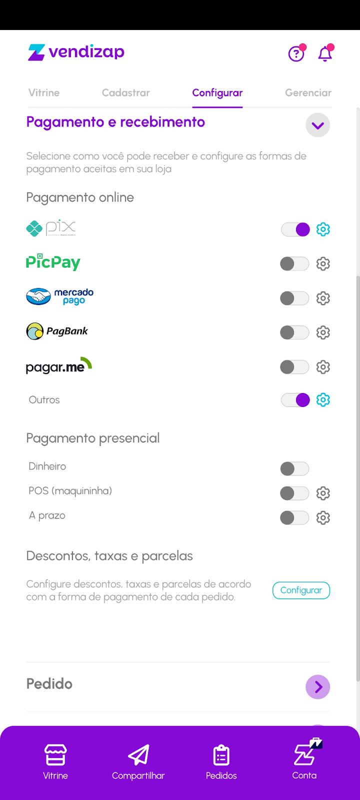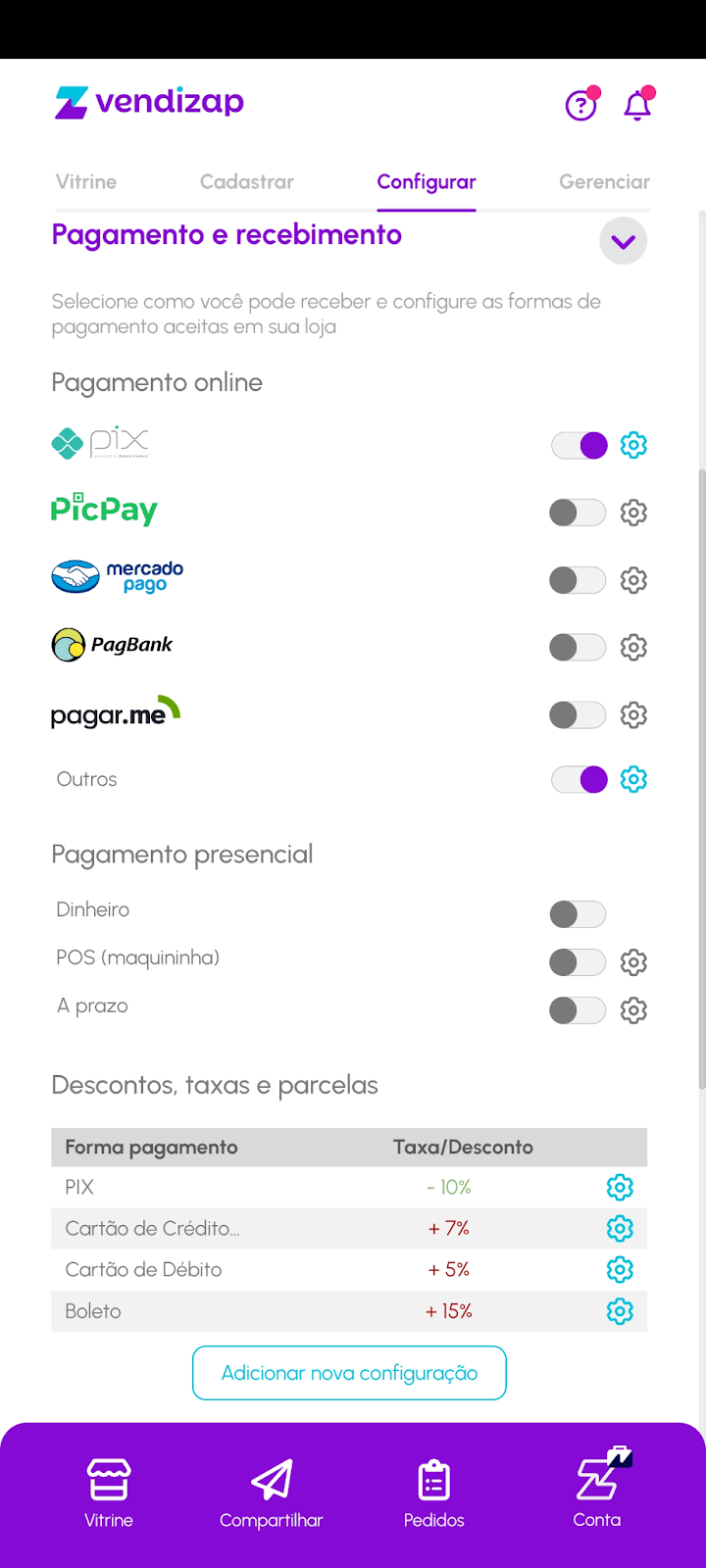 Na parte inferior da tela de formas de pagamento, clique em "Configurar" dentro da área Descontos, taxas e parcelas.