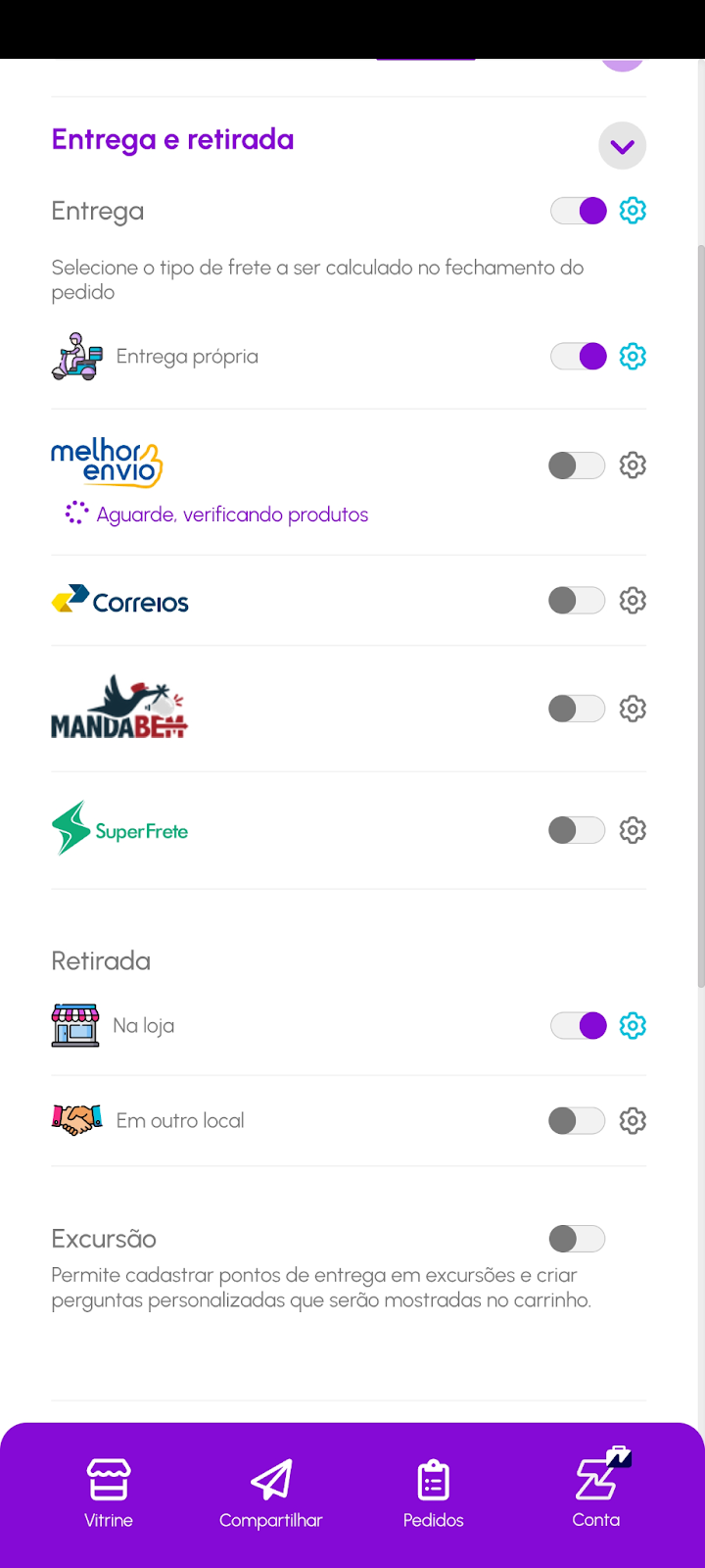 Dentro das configurações, acesse a seção "Entrega e retirada". Localize a opção Melhor Envio.