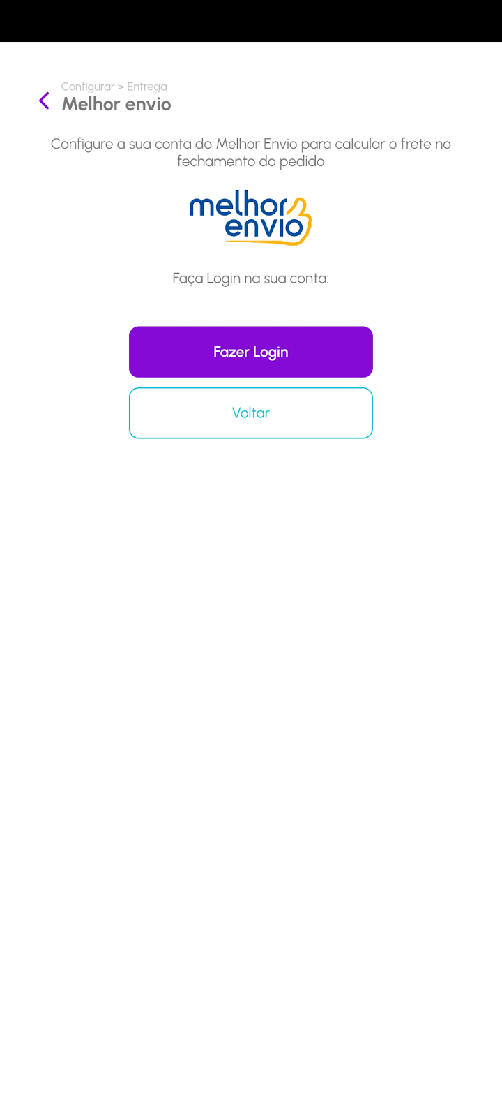 Você será redirecionado para a tela de login do Melhor Envio. Clique em "Fazer login" e autorize a conexão entre as plataformas.