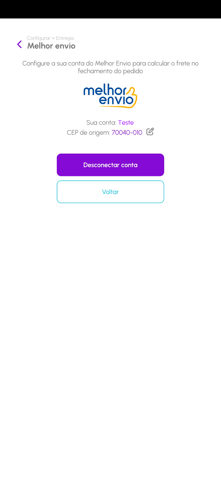 Após o login, sua conta será exibida com o CEP de origem configurado. Isso indica que a integração foi concluída com sucesso.
