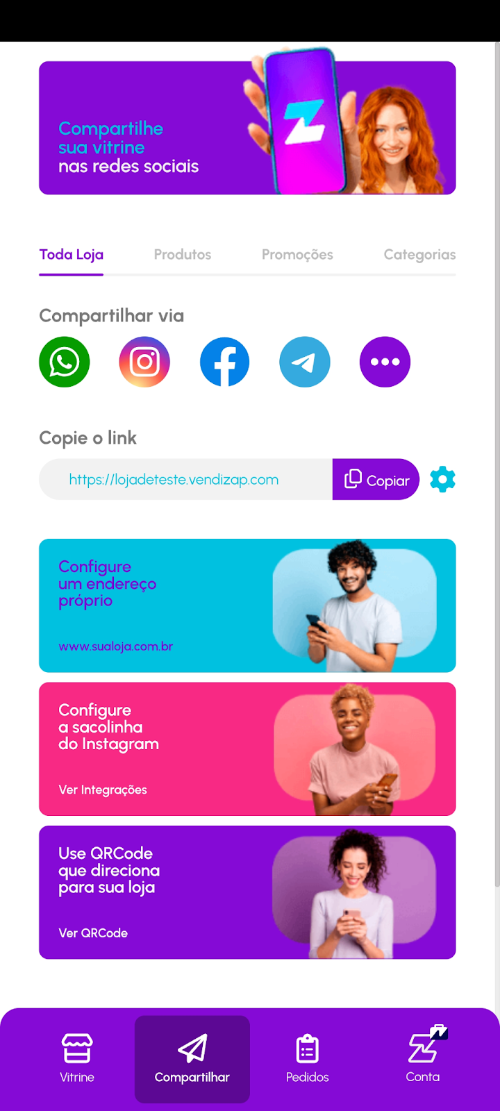 Após cadastrar pelo menos um produto, você pode acessar o "Compartilhar", onde você pode copiar e divulgar o link da sua loja virtual. Esse recurso facilita o envio do endereço da sua loja para os clientes, seja por redes sociais, WhatsApp ou outros canais.