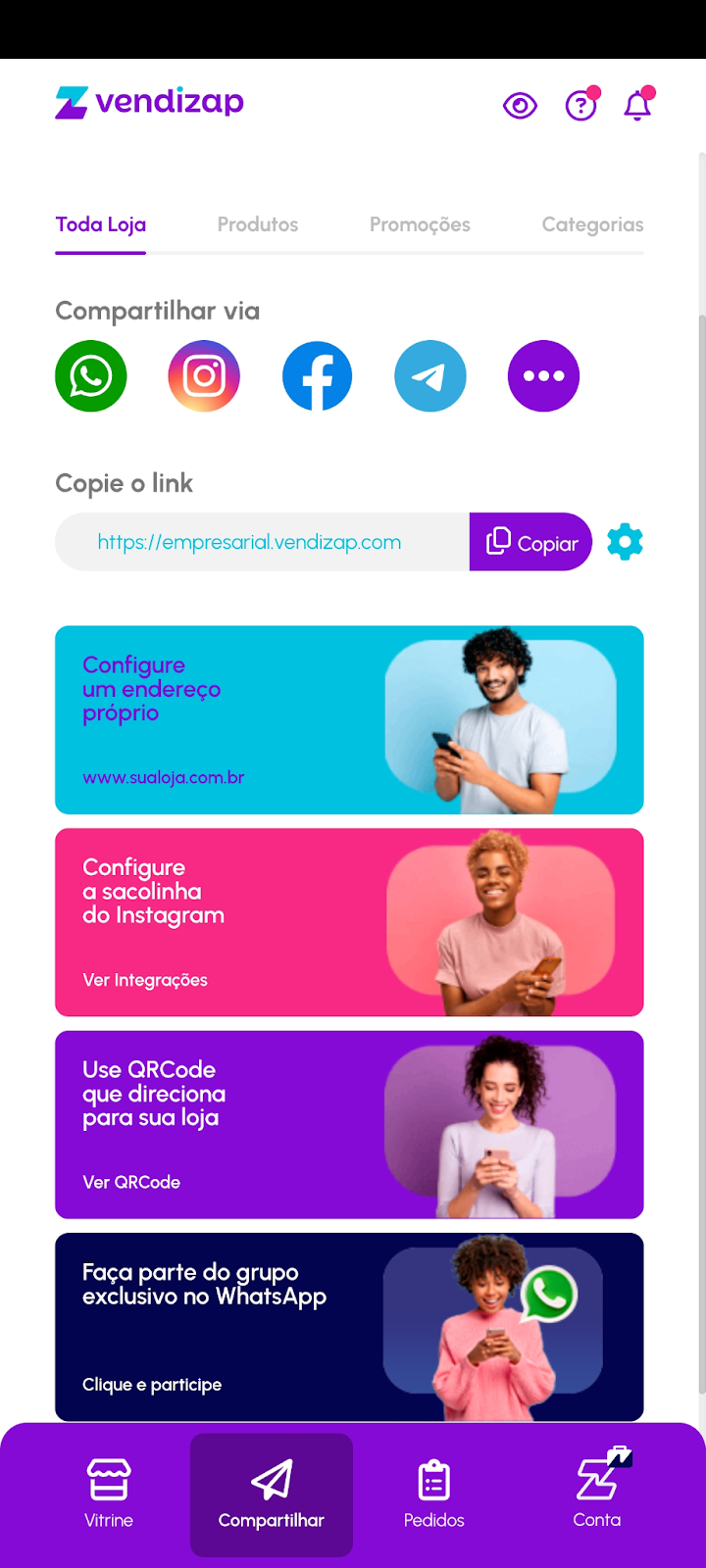 O Menu Compartilhar do Vendizap permite que você divulgue sua loja e produtos facilmente, aumentando o alcance e as vendas.