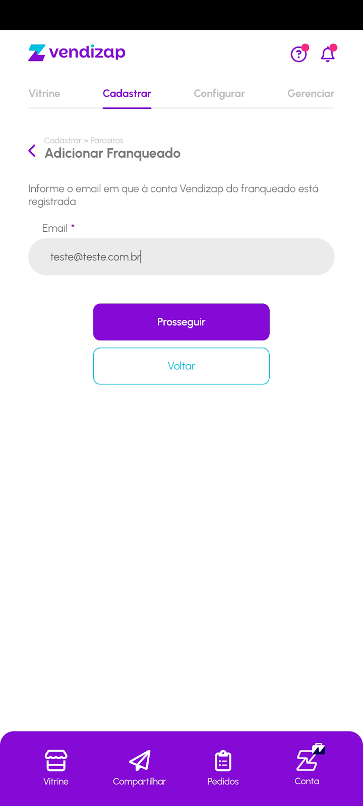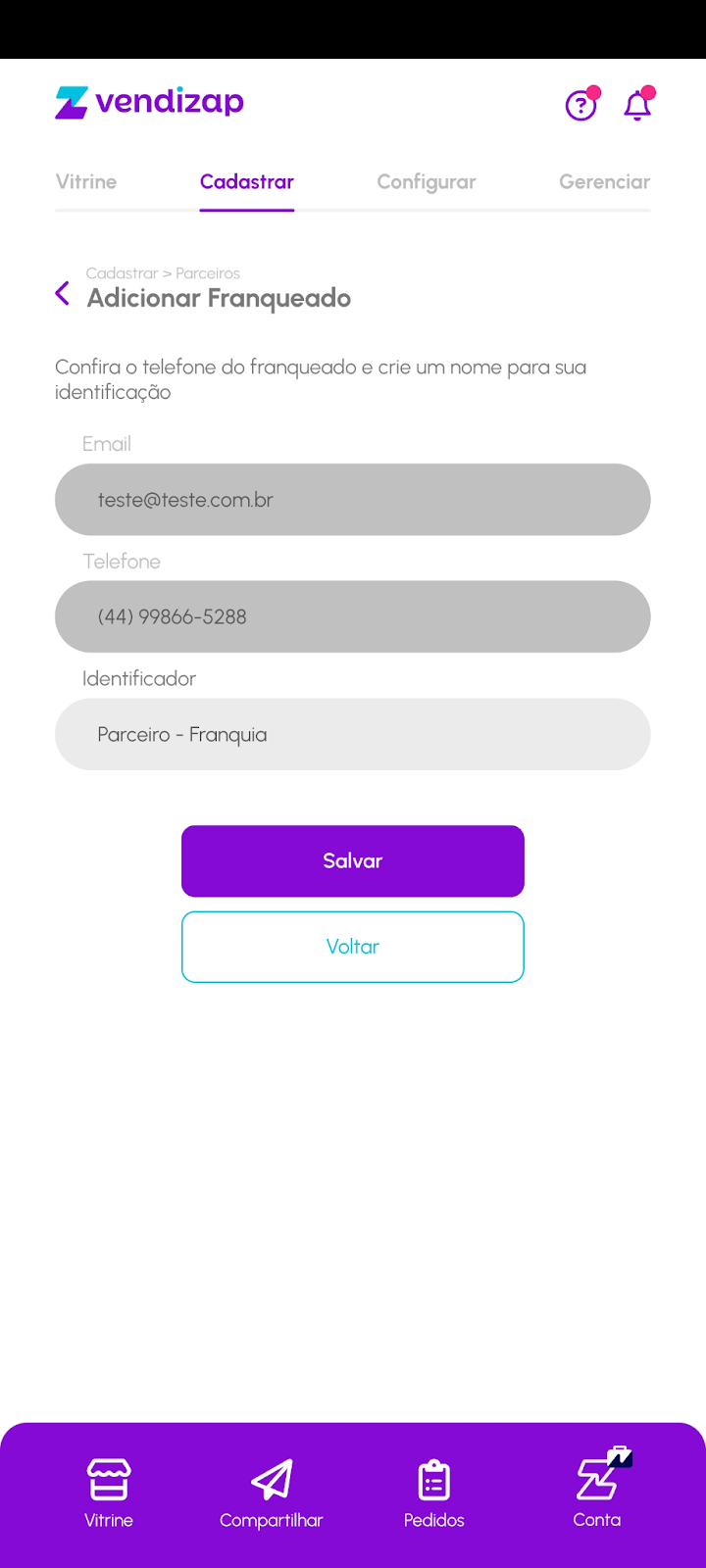 Informe o nome e telefone do parceiro franqueado. Confirme o vínculo e clique em "Salvar".