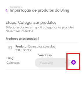 O Vendizap trás a categoria que foi cadastrada no Bling, caso não tenha no Vendizap ela precisa ser criada, clicando no botão “mais” o sistema já tras caregado o nome da categoria, basta clicar em salvar. Nesta tela ainda é possível adicionar outra categoria que já tenha no vendizap.