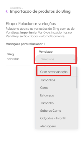 Nesta tela se a variação já existir no Vendizap é feito o relacionamento automaticamente.