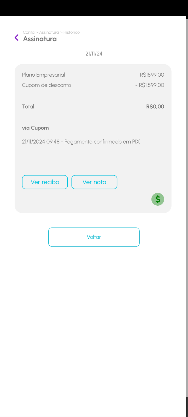 Na tela de assinatura, selecione a opção “Histórico” para visualizar os pagamentos já realizados.