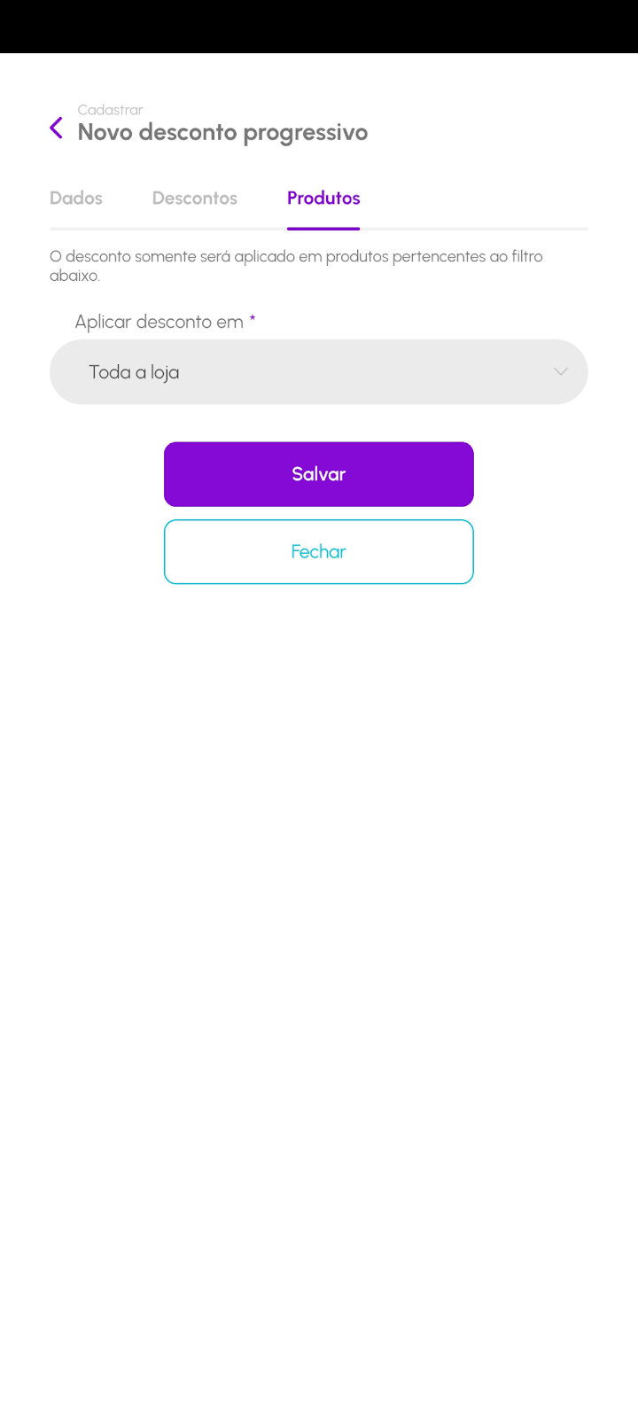 Por fim, defina se o desconto será aplicado em todos os produtos da loja ou apenas em produtos específicos.