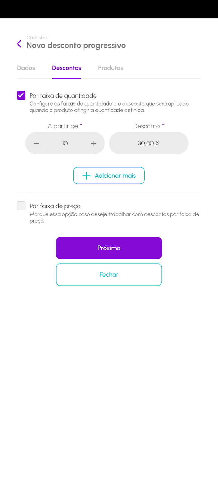 O recurso de desconto progressivo permite oferecer condições especiais para incentivar o cliente a comprar mais — seja por quantidade ou valor de compra. Essa estratégia ajuda a aumentar o ticket médio da loja.