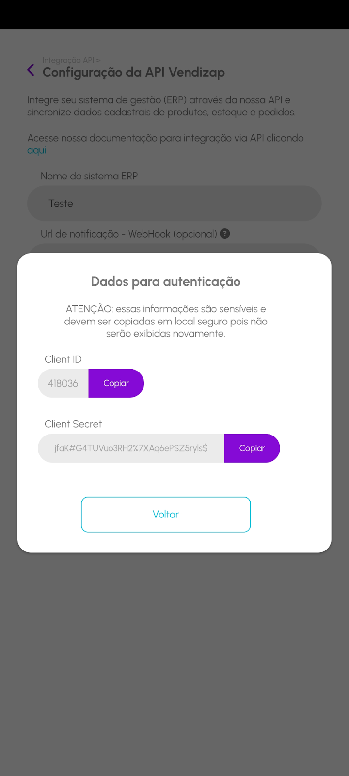 Encaminhe essas credenciais para o seu ERP para concluir a configuração.