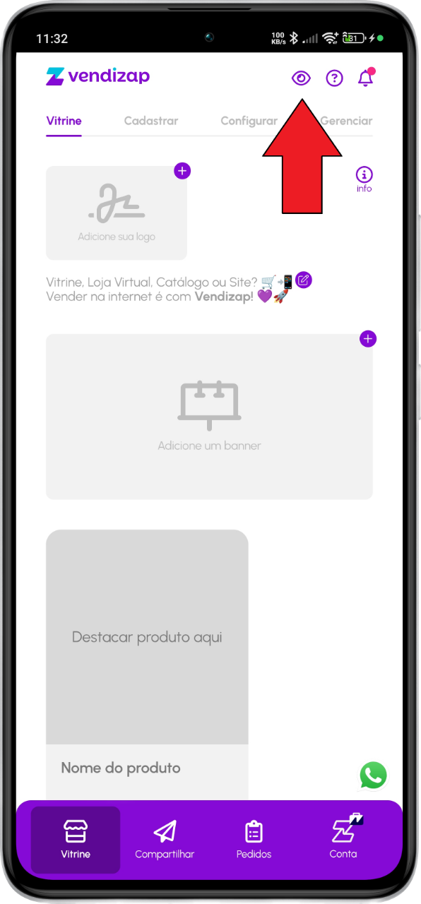 A primeira é acessando a sua conta Vendizap, na página inicial você pode clicar no ícone de "Olho" e ele abrirá a sua loja direto, assim isso você pode selecionar os produtos, adicionar ao carrinho e finalizar o Pedido. E depois disso pode retornar para a sua conta Vendizap normalmente, prático e rápido.