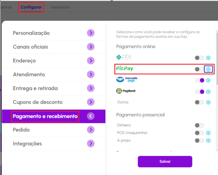 Com o x_picpay_token copiado, vá ao Vendizap em Menu Configurar - Pagamento e Recebimento - Picpay - ative e clique no ícone de configurar