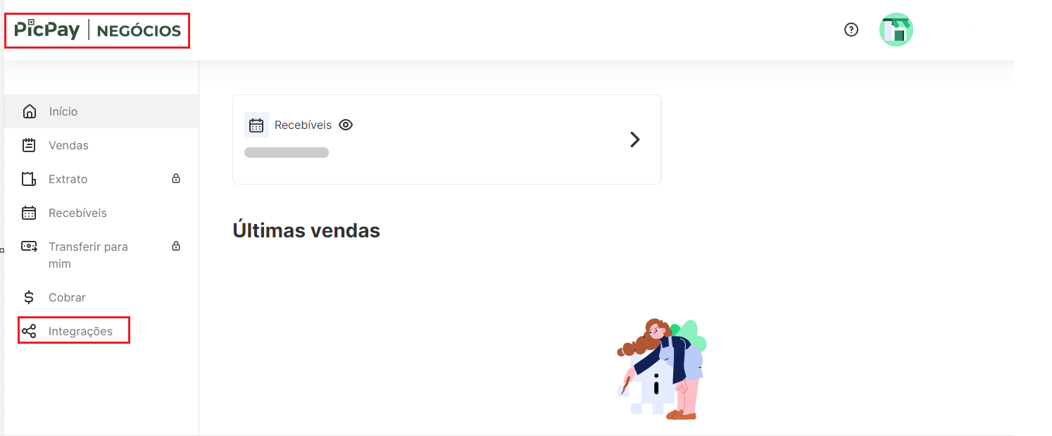 Acesse o PicPay Negócios https://painel-negocios.picpay.com/inicio. Acesse a aba Integrações.