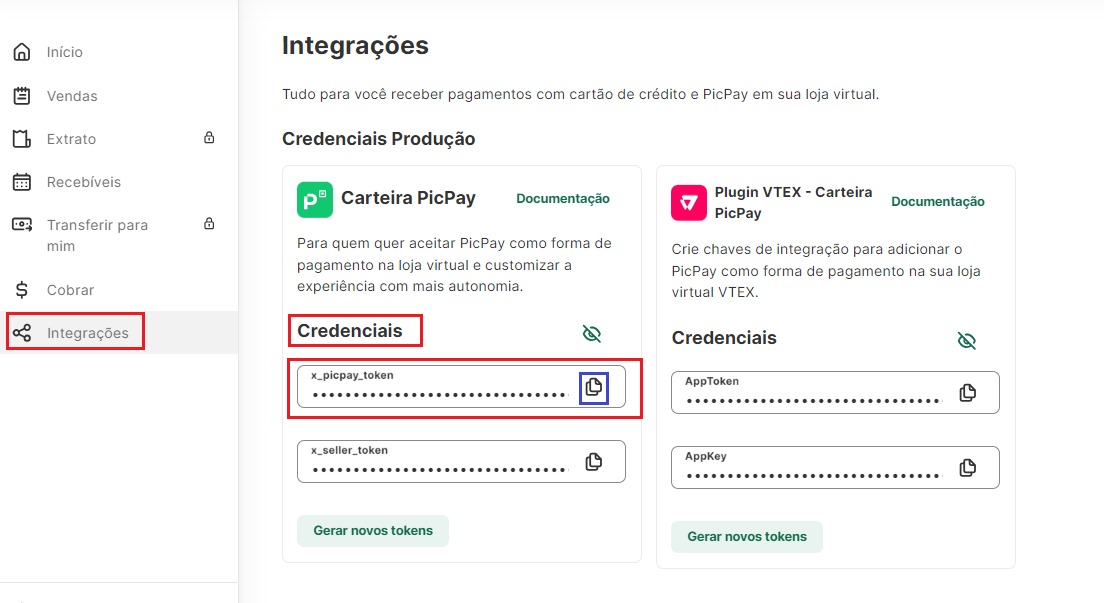 Dentro do menu Integrações - vá até Credenciais. Clique no ícone de copiar e copie o x_picpay_token