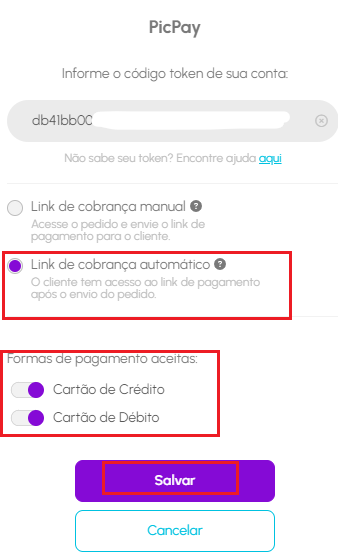 Em seguida no Vendizap configure o link de cobrança automático para ser exibido no sistema ao final do pedido. Configure as formas de pagamento que irá usar no Picpay e salve.