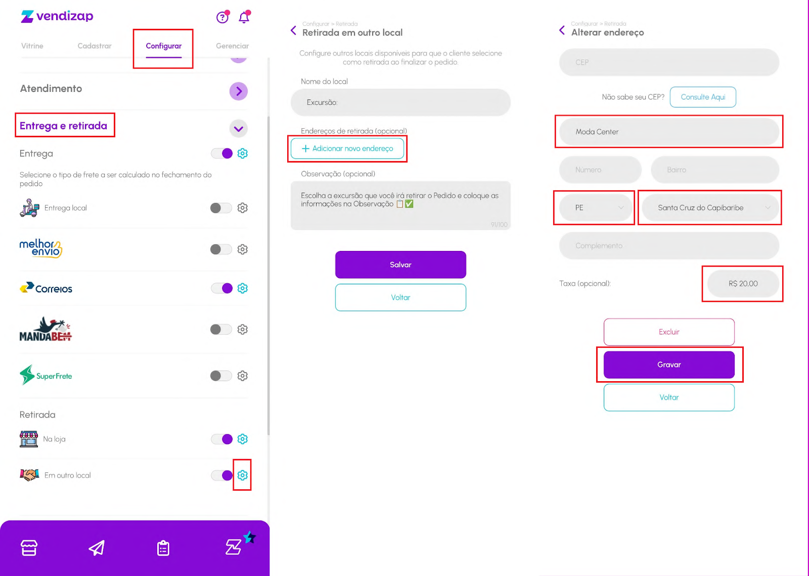 Cadastre um Endereço (obrigatório informar pelo menos a Cidade) e a Taxa de entrega que você vai utilizar nesta modalidade (opcional).