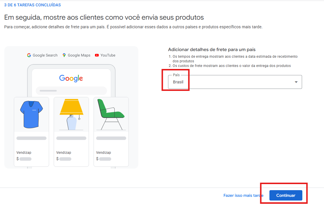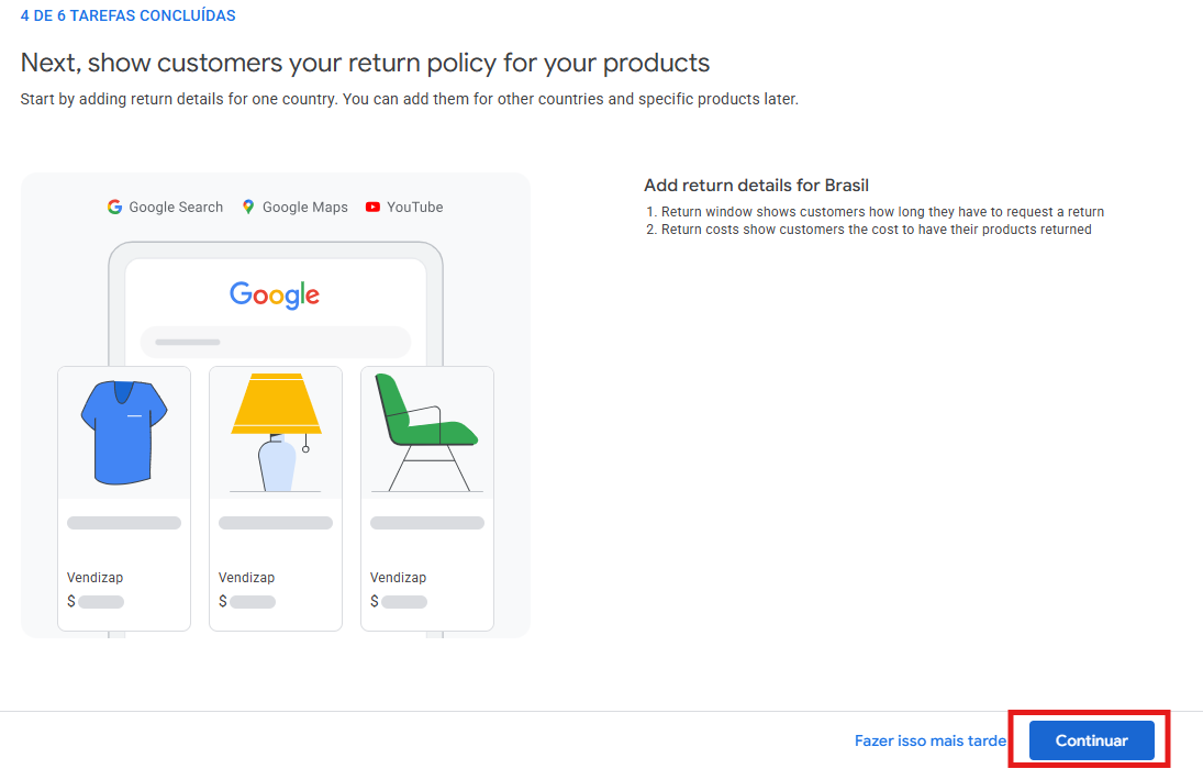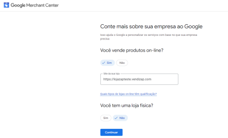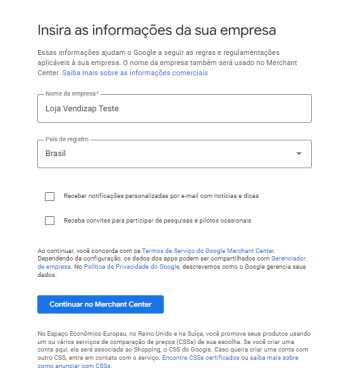 Role para o final da tela e clica em Continuar no Merchant Center.