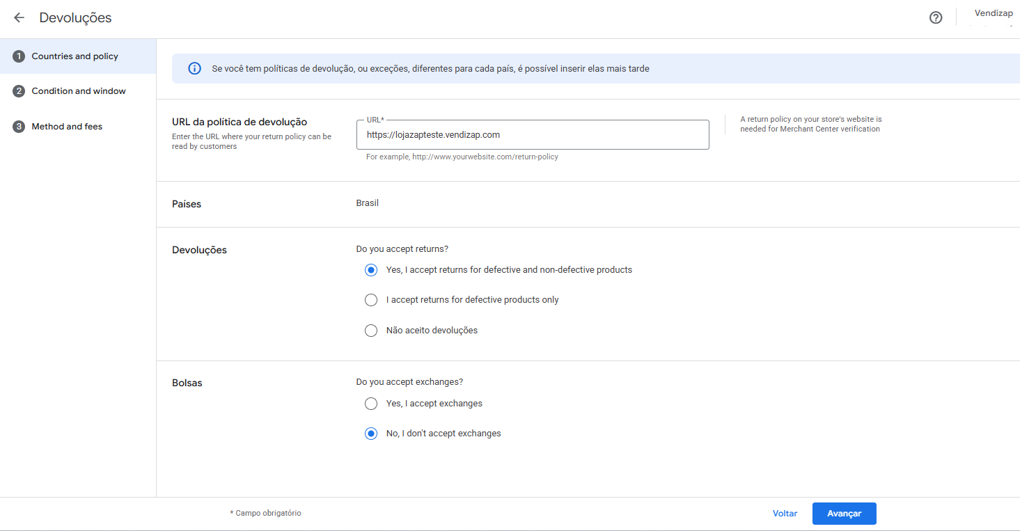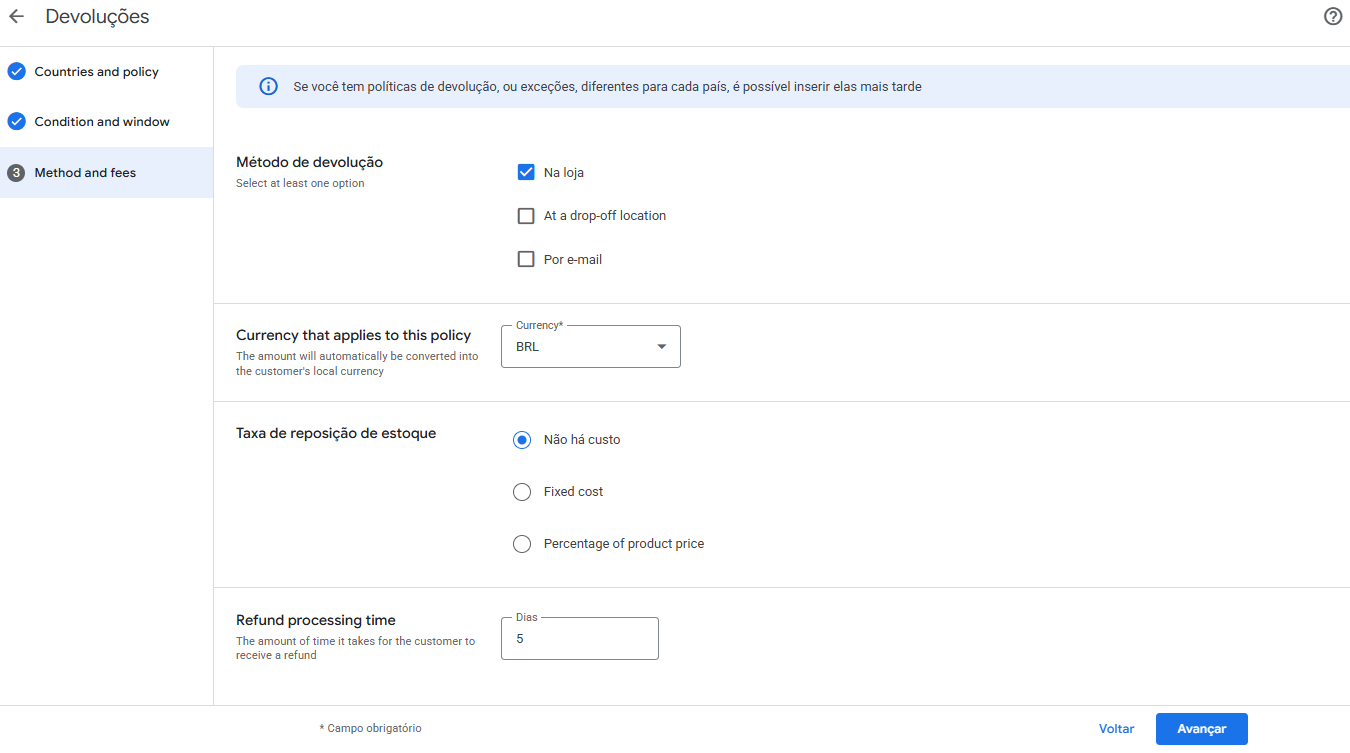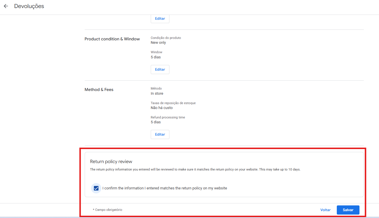 Configure a política de devoluções