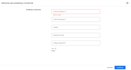 Etapa 01 - Adicione seu endereço comercial. Após inserir, clique em continuar.