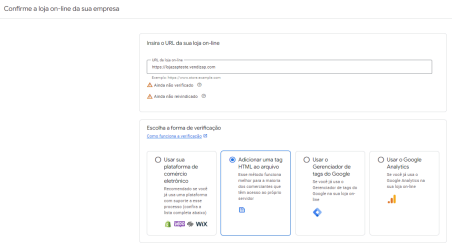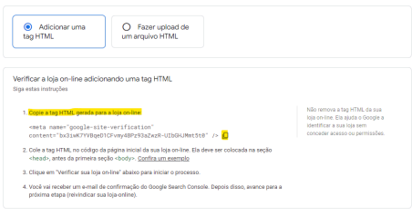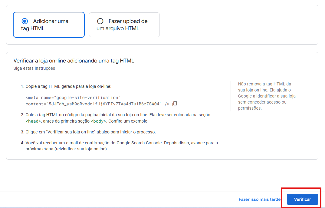 Escolha a forma de verificação - Utilize Adicionar uma Tag HTML ao arquivo