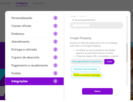 Com a tag copiada vá ao Vendizap em Menu Configurar - Integrações - Google Shopping - Verificar domínio no google