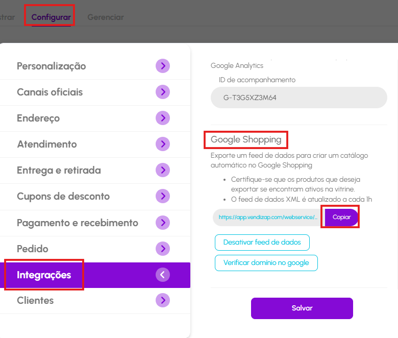 Vá ao Vendizap em Menu Configurar - Integrações - Google Shopping - e clique em copiar no link de dados