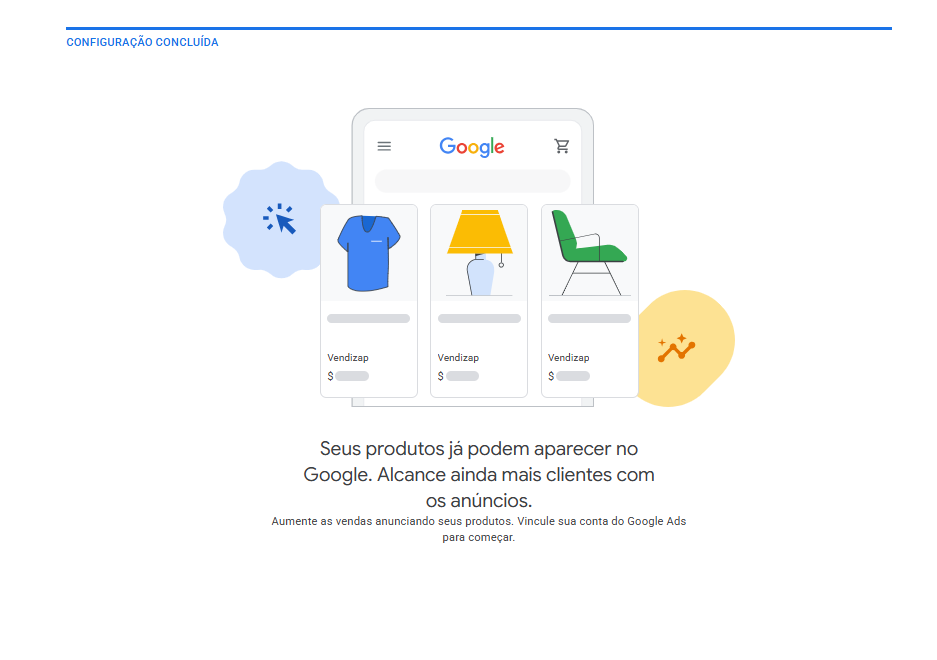 Na tela inicial do Merchant Center, aba produtos você pode acompanhar se os produtos estão sendo aprovados ou se ainda estão em análise.