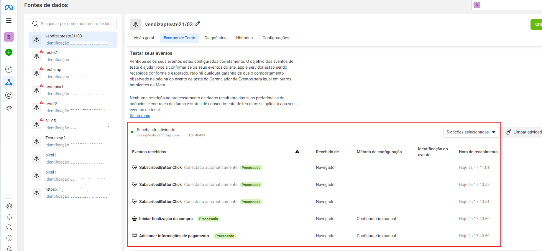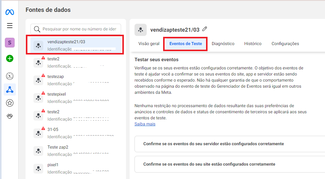1 – Acesse novamente o Gerenciador de Eventos e clique no pixel instalado em sua loja. Em seguida clique na aba Eventos de teste.
