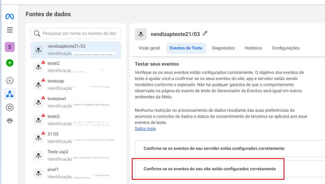 2- Selecione a aba Confirme se os eventos do seu site estão configurados corretamente.