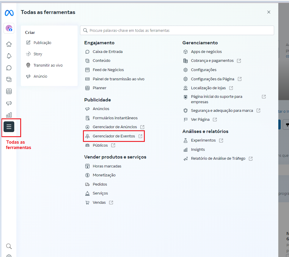 2 – No menu lateral esquerdo da página inicial acesse ‘Todas as Ferramentas’ > ‘Gerenciador de Eventos’