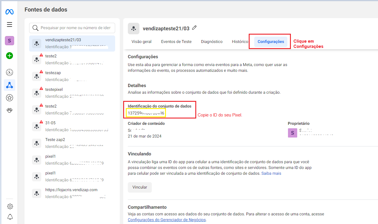 1 – Copie o Código Identificador do Pixel da plataforma do facebook