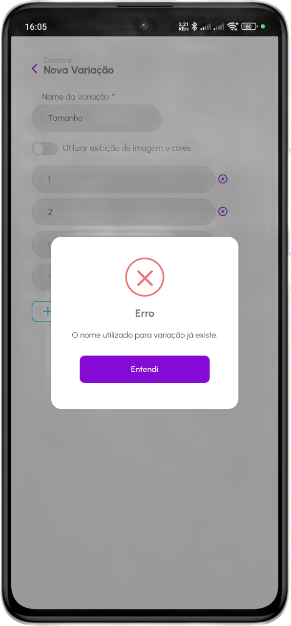 Por exemplo, você já cadastrou uma Variação chamada Tamanhos e depois tentou cadastrar uma nova Variação com o mesmo nome, então o sistema não irá permitir porque se trata de uma duplicidade e que pode gerar erros na gestão!
