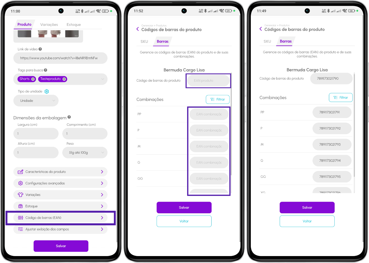 Você pode cadastrar e gerenciar os códigos de barras utilizados para cada produto de forma única ou para produtos e suas combinações (ex: P,M, G).