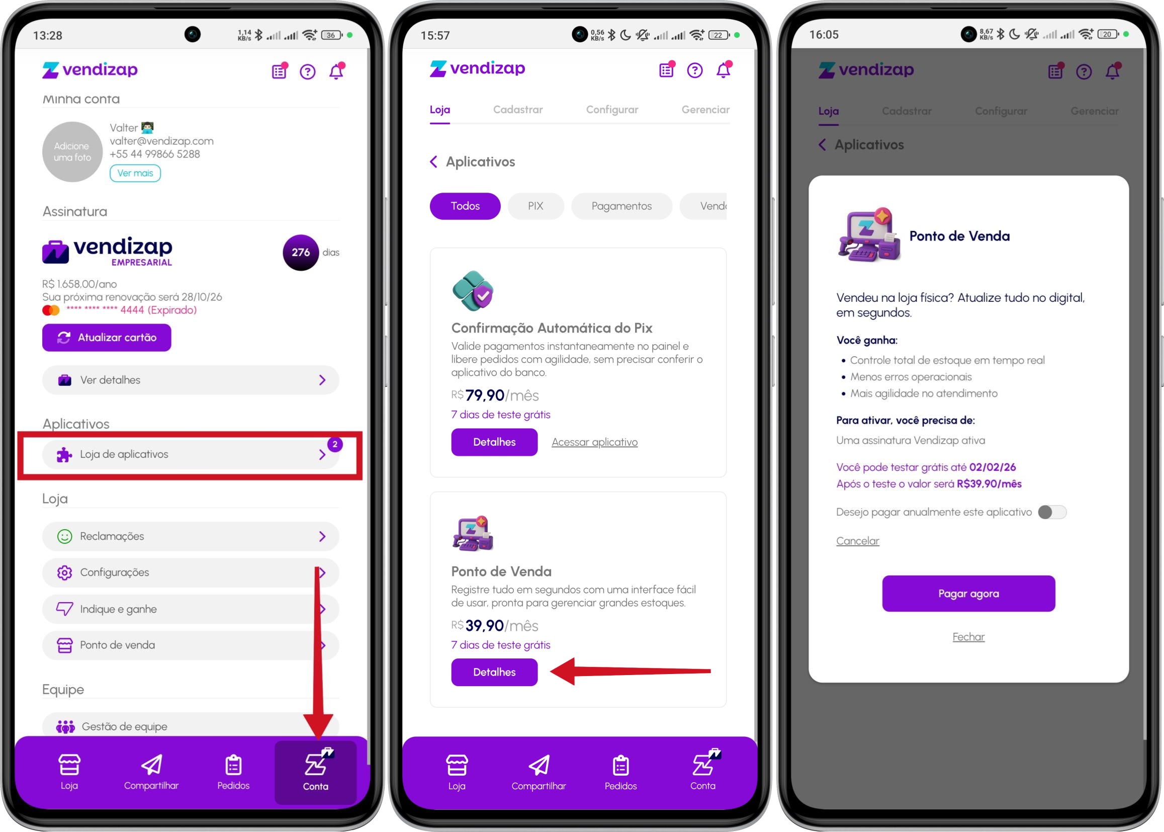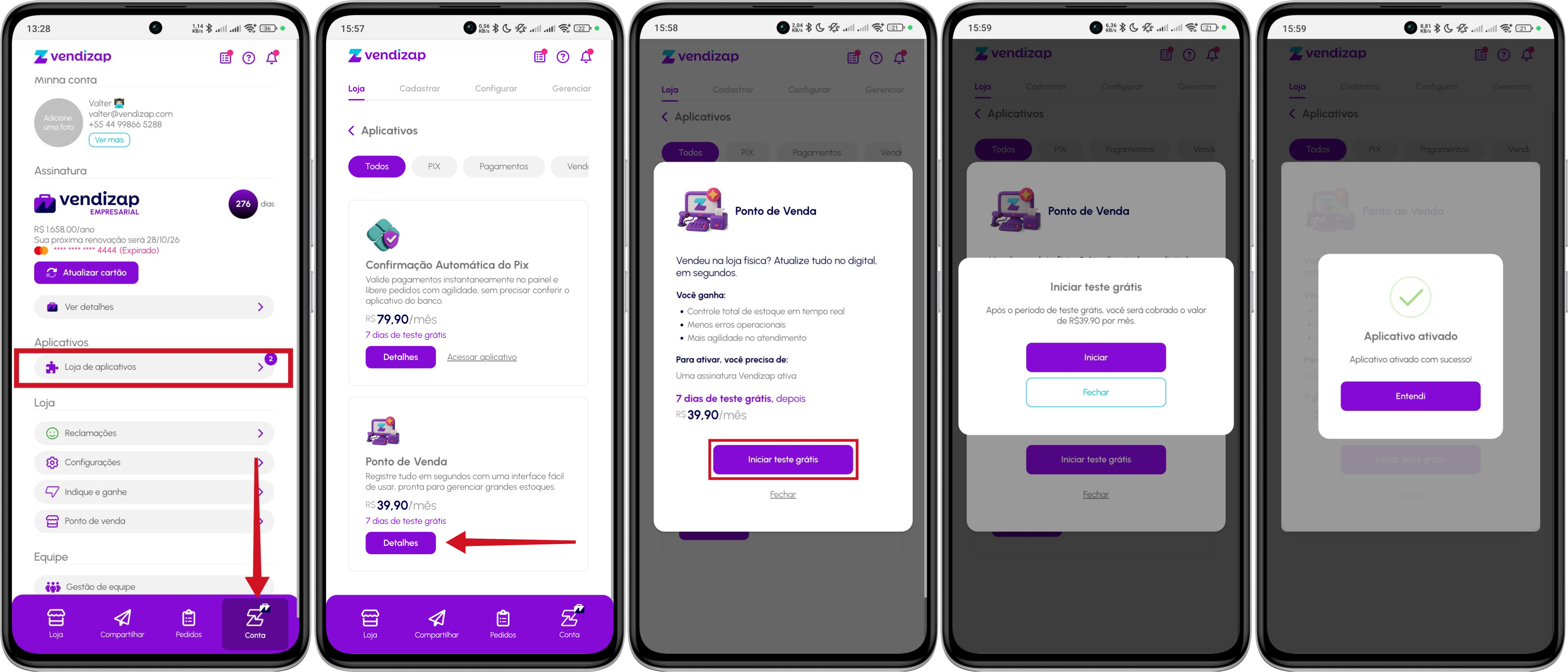 Para ativar o aplicativo PDV/Ponto de Venda acesse a sua conta Vendizap e vá até o Menu Conta> Loja de aplicativos, clique em “Detalhes” na opção Ponto de Venda e depois em “Iniciar teste grátis”.