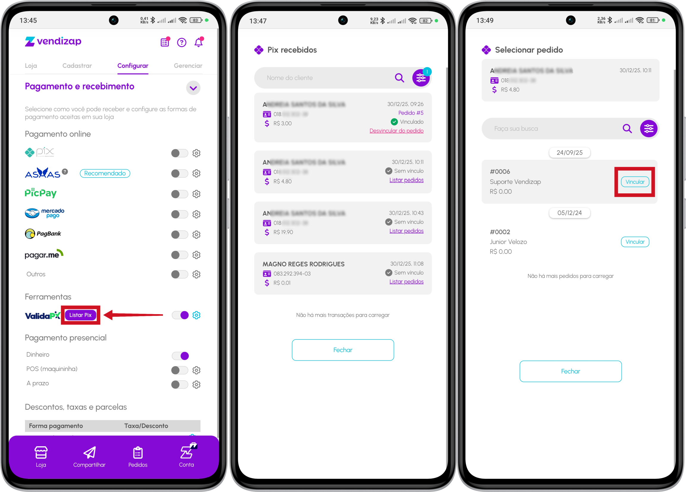 Nesta tela você pode listar e filtrar todos os Pix recebidos e clicando em “Listar pedidos” o sistema mostra a lista de pedidos para você selecionar e vincular.
